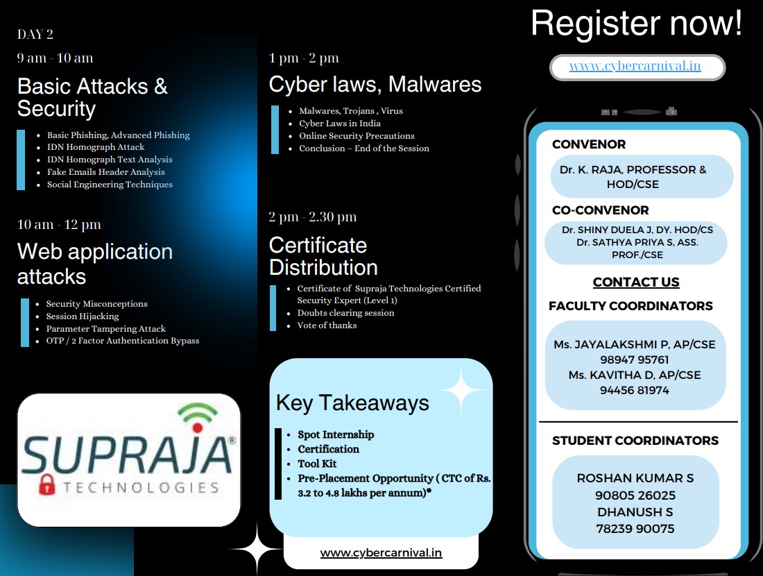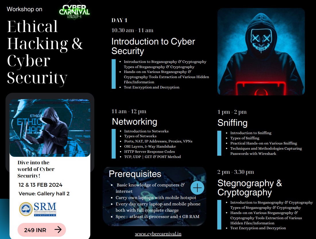 Join our dynamic workshop on Sniffing, Steganography, Cryptography, Basic Attacks, and Offensive Security! Delve into the intricacies of network sniffing, uncovering hidden messages through steganography, and mastering cryptographic techniques. Explore the fundamentals of basic attacks and offensive security strategies to fortify your digital defenses. Led by seasoned experts in cybersecurity, this workshop offers hands-on experience and invaluable insights into the world of information security. Whether you're a novice or a seasoned professional, expand your knowledge and sharpen your skills in this comprehensive training session. Don't miss out on this opportunity to enhance your understanding of cybersecurity essentials!